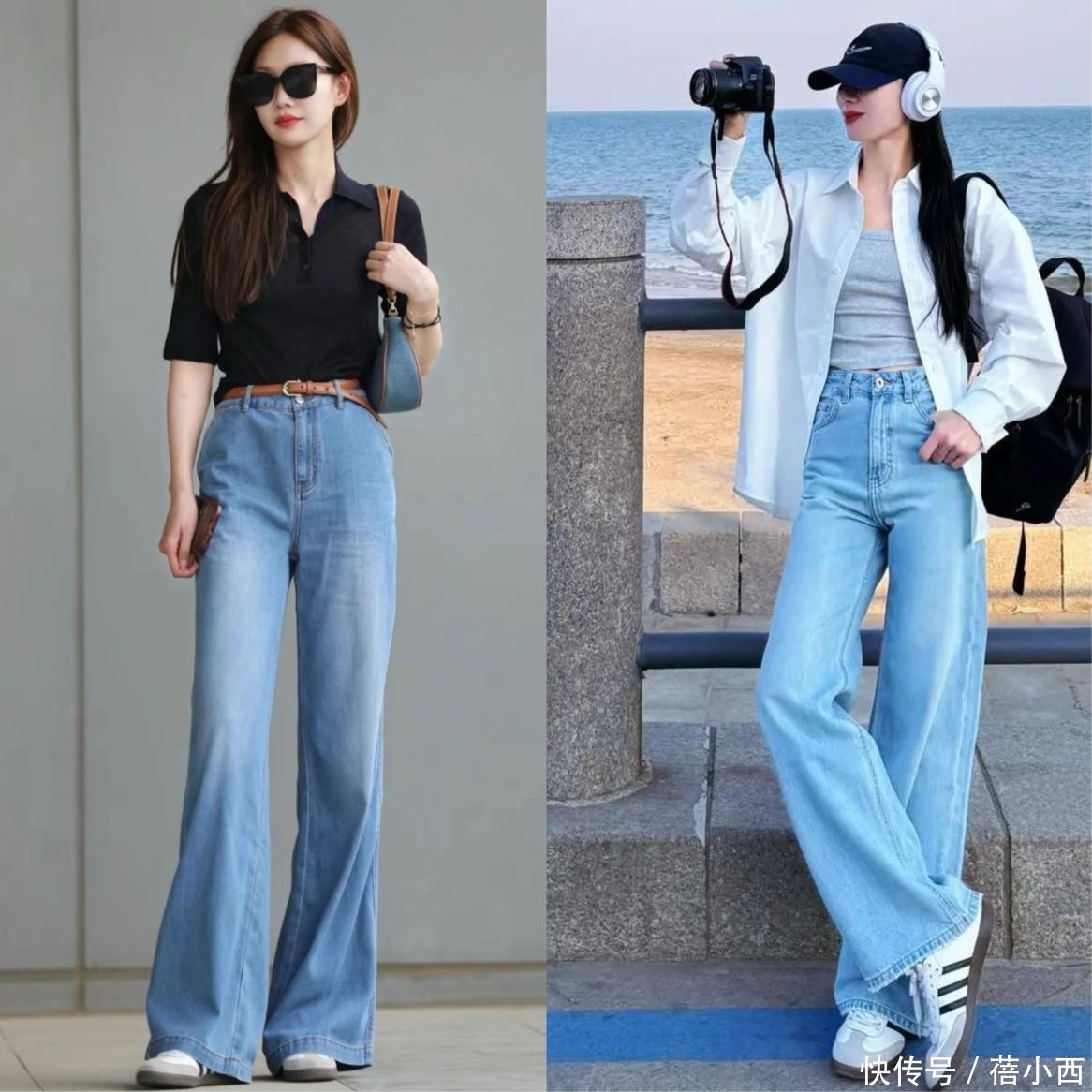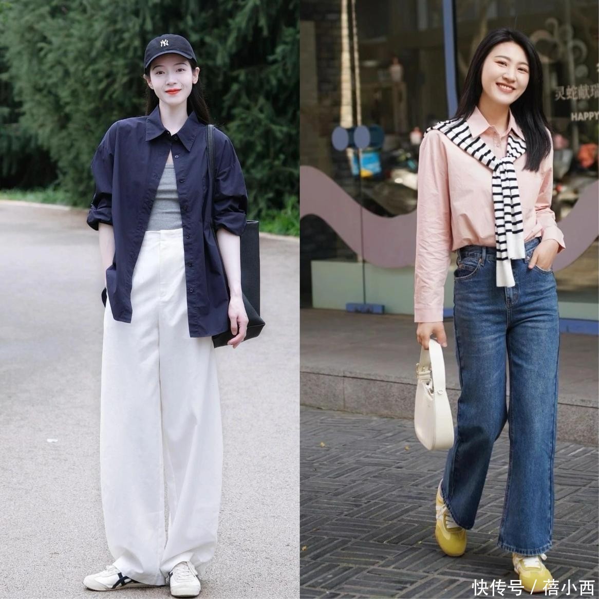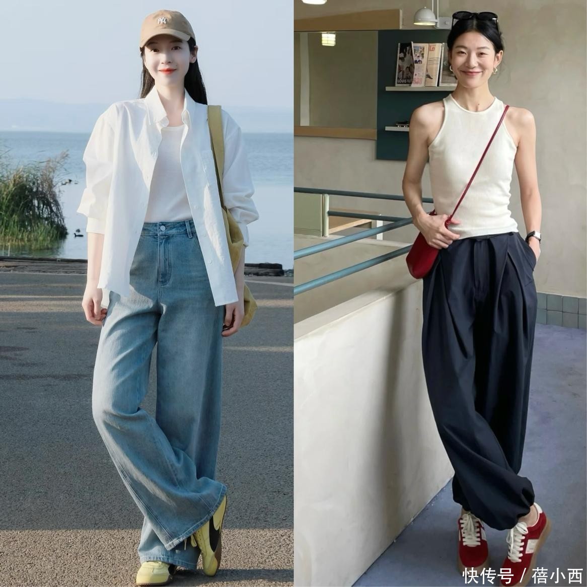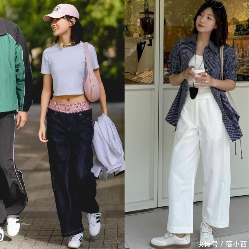 这是最常见、最接地气的穿法,适合日常逛街、通勤、上学。下半身选择纯色高腰阔腿裤,搭配简约的衬衫,脚踩经典黑白德训鞋,整体造型干净利落。想要增加细节感,可以搭配帆布包、棒球帽,或是在腰间系一条简约腰带,突出腰线,松弛感瞬间拉满,不刻意凹造型也能穿出时尚感。