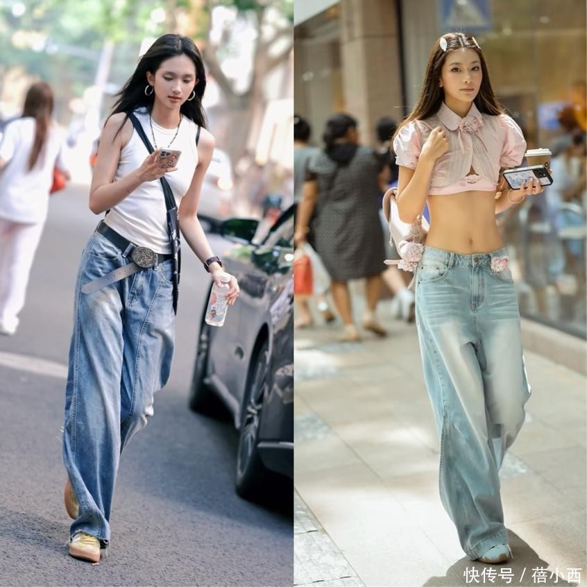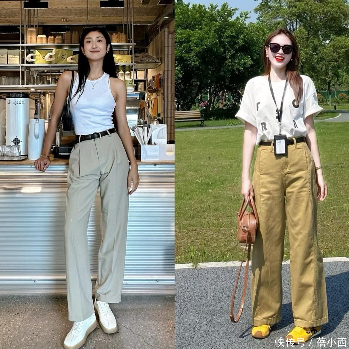 此外,用t恤搭配阔腿裤和德训鞋也很经典,但我们的腰线一定要拉高,选择高腰款阔腿裤,或是将上衣塞进裤腰,目的是明确腰线位置,优化身材比例,避免五五分身材。