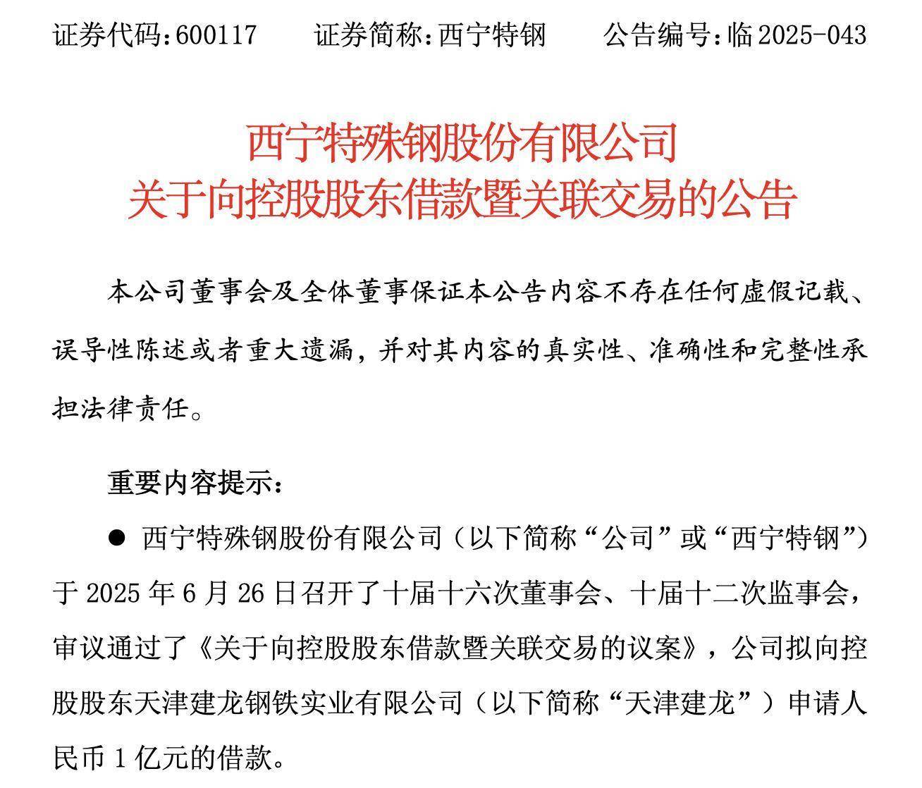 6月26日晚间,西宁特钢(600117)公告,公司拟向控股股东天津建龙定增募资不超10亿元(含本数),扣除发行费用后的募集资金净额拟全部用于补充流动资金。